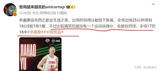 而在重返西乙联赛以后,余嘉豪的状态也是非常不错。这一场比赛,他登场25分钟,砍下16分5板,还有1次助攻1次盖帽进账。全场比赛,他的出场时间和得分数据,都刷新了征战海外联赛新高。不过,颇为有趣的是,这一场比赛,余嘉豪全场比赛竟然没有一次出手,全场比赛,他的16分得分,全部是来自于罚球。此役,他罚球17罚16中,靠着罚球也拿到了16分。