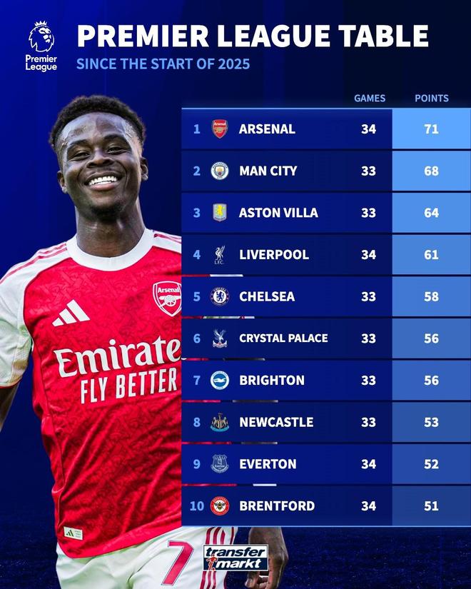德国转会市场网站列出了2025年至今英超积分榜,阿森纳以71分钟居首,曼城以68分第二,维拉以64分排名第三。